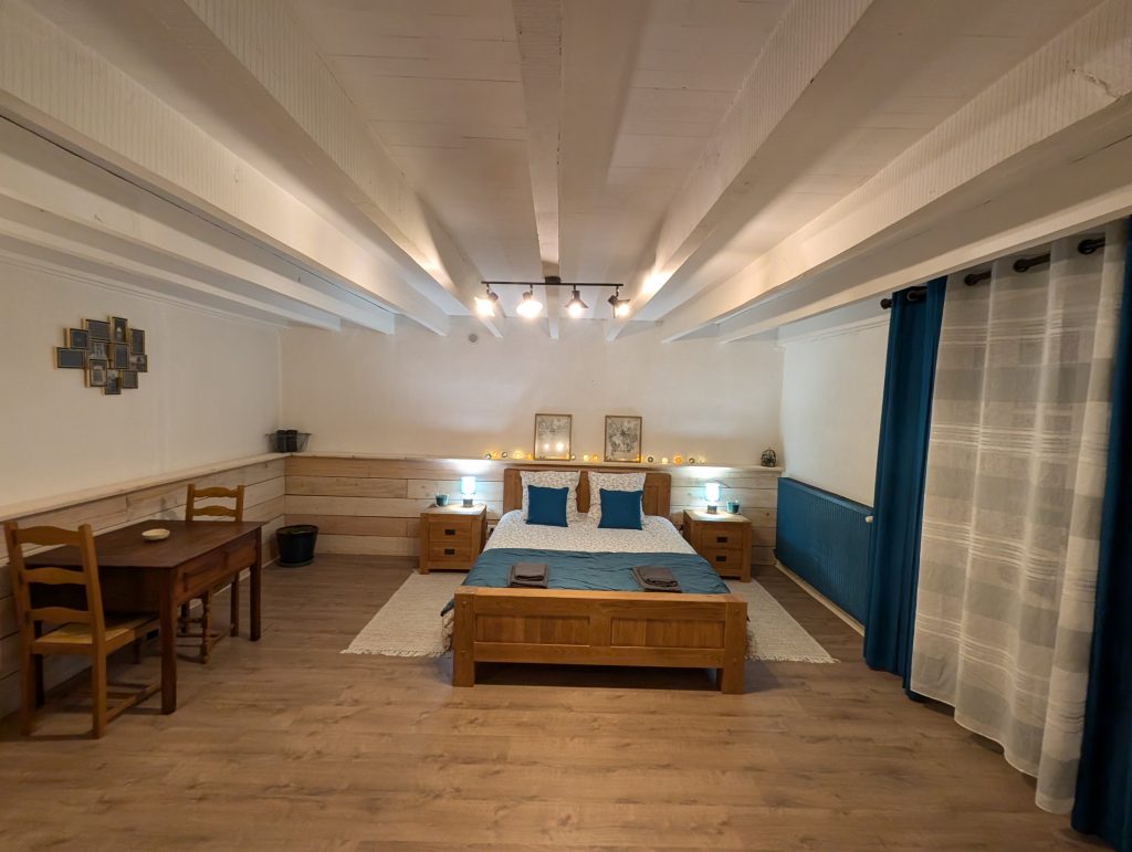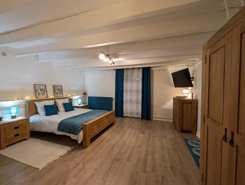 La chambre de près de 25m² vous offre le confort d’un grand lit Queen size, avec TV et table d’appoint.